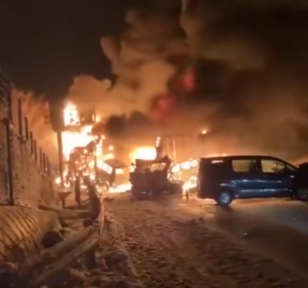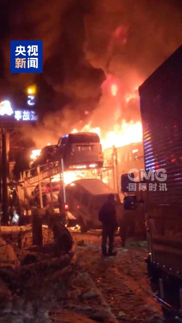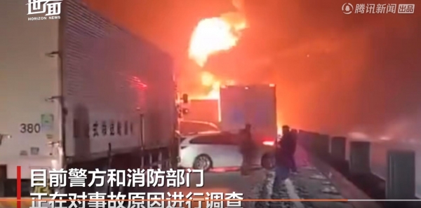 事故发生约一小时后,现场突发火灾。受损车辆的燃油泄漏引发熊熊大火,火势迅速蔓延至10余辆车,其中一辆大型卡车的火焰最高达数米,滚滚浓烟弥漫夜空,能见度不足百米。即便远处的车辆发现了危险,也因无法脱身而被困在碰撞链中。一位60多岁的卡车司机描述:"我躲避失控车辆撞上隔离带后,转头就听到四次剧烈爆炸声,火势瞬间吞噬了前方三辆汽车,整个路面都在燃烧,热浪灼人,前方完全看不清。"