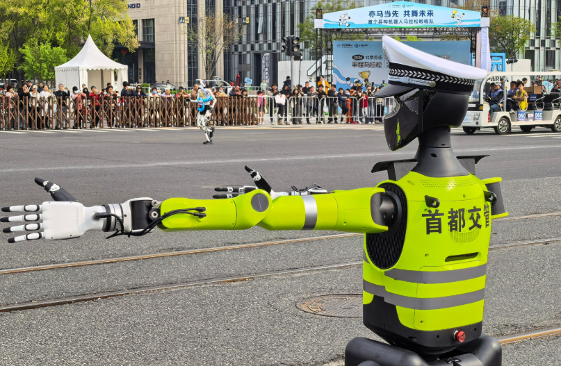 早上7点30分,北京亦庄半程马拉松鸣枪开跑,在赛道转弯处,身着荧光绿交警制服的北京交警机器人稳稳站立,标准做出左转指挥手势,同时搭配清晰语音提示,有序引导参赛选手前行,动作流畅规范,丝毫不逊色于人工交警。这款机器人名为"天轶",是北京本土自研的人形机器人,也是2025年机器人马拉松冠军"天工"的同系列产品,由专业团队历经专项训练、功能优化与多次实测调试后,才正式投入使用。