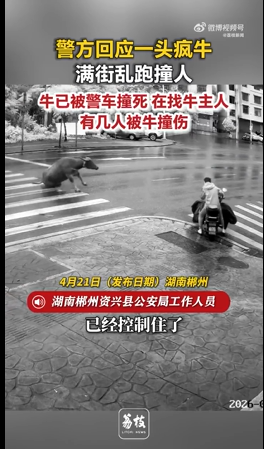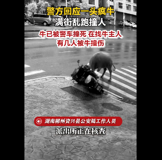 疯牛满街乱跑撞人,公安局回应:牛已被警车撞死,目前正在查找牛主人 2026-04-21 15:51 今日头条 4月21日,湖南郴州,一头牛突然发疯满街乱跑撞人,画面显示路人弃车逃跑,电瓶车被牛掀翻。 对此,资兴县公安局回应,牛已被警车撞死,警察目前正在查找牛主人,有几人被牛撞伤。