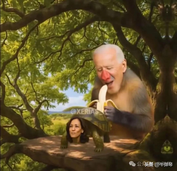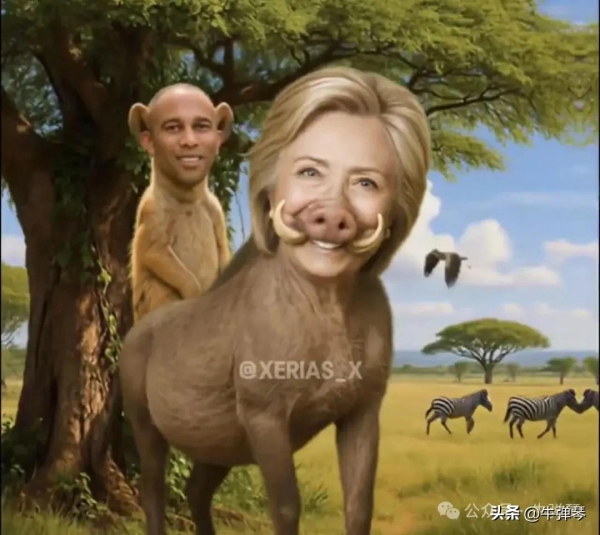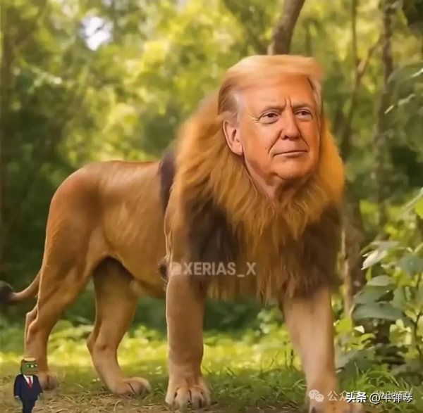 这段特朗普支持者AI制作的视频中,还有很多让人哭笑不得的形象,比如,希拉里被描绘成了疣猪、拜登成了猴子、哈里斯是乌龟,而特朗普,则是威风凛凛的丛林之王--狮子。
