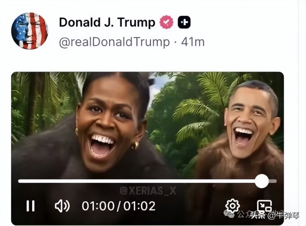 已经深夜11点多,特朗普在自己的社交账号上,发了一条短视频,视频中,美国前总统奥巴马和夫人米歇尔,变身成了两只大猩猩。