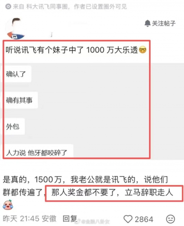 网传截图显示,一位科大讯飞的员工买彩票中了1500万元,随即未做工作交接、主动放弃工资奖金,直接离职。