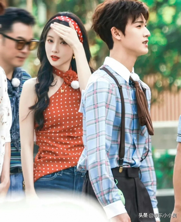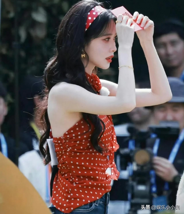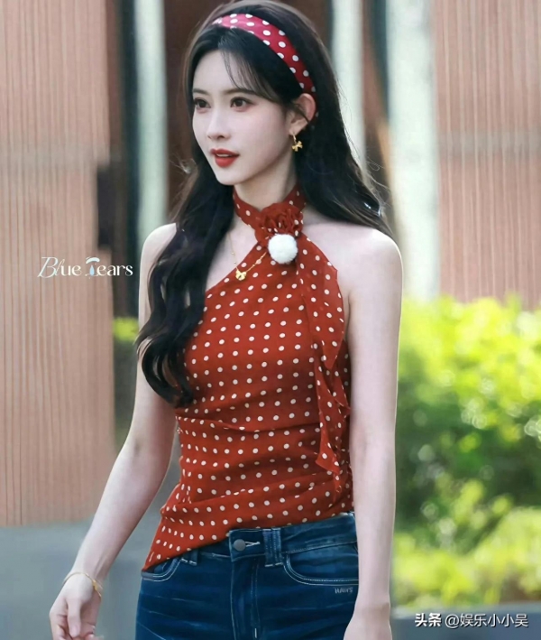 她本身身高170cm,穿上高跟鞋后看着快有180cm,红色波点挂脖上衣搭配高腰牛仔裤,身材比例被衬得特别好。