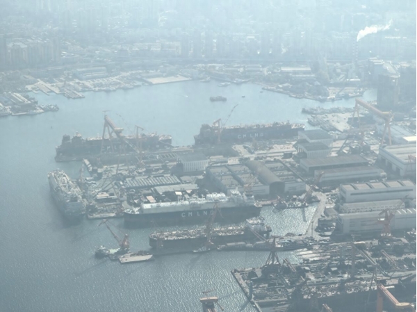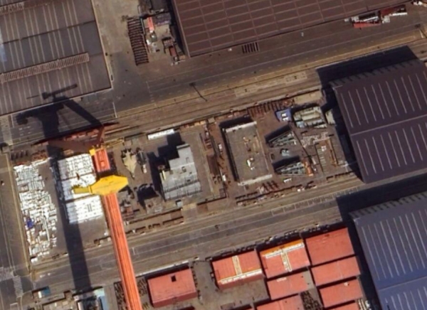 干船坞内建造中的船体局部放大,明显可见内部有"方盒子"状结构