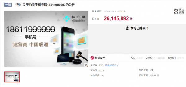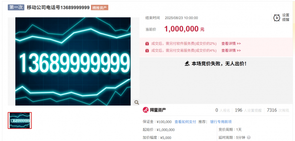 近期,一个手机号码因其尾号连续九个"9"而在某拍卖平台上引起了广泛关注。该号码以高达100万元的价格作为起拍价进行拍卖,然而,在8月23日为期24小时的竞价过程中,却未能吸引任何买家出价,最终导致流拍。