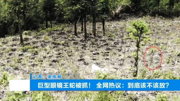 让人万万没想到的是:这条危险的巨型眼镜王蛇,没有隔离管控,没有无害化处置,工作人员直接把它拉到附近野外,原样放归大自然。