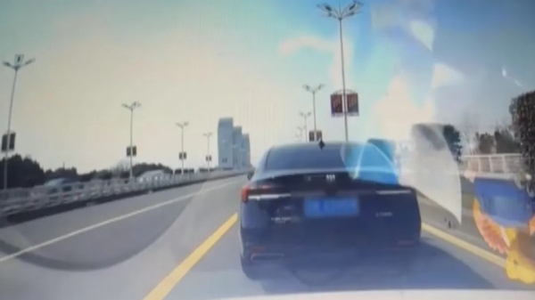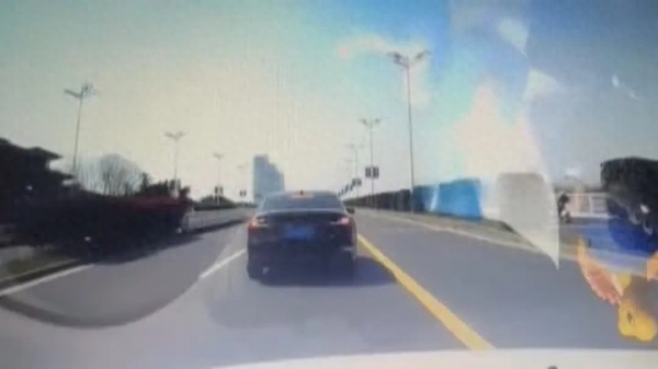 行车记录仪显示:当天下午一点多,马女士驾车由东向西准备驶上文昌大桥,当时她行驶在最左侧车道,一辆黑色轿车突然从右后方快速超车。随后,惊险接连上演。马女士说:"他从中间车道上来,上来就往我们前面一转,然后就踩了刹车。我就慢慢绕到中间车道,他就在中间虚线上来回转,左右晃。看到我稳定在中间车道的时候,他也跟着到了中间车道,然后又是一脚刹车。"