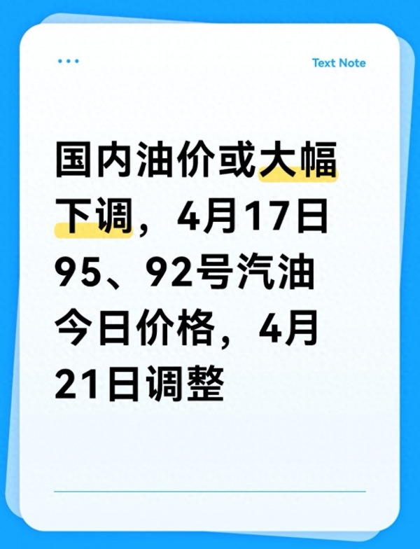 开年以来,国内油价一路涨,不少车主加油时都直皱眉,加一箱油多花好几十,日常用车成本明显往上窜。不过好消息来了,根据最新的市场监测数据,4月21日24时,国内成品油调价窗口将再次开启,这次油价大概率要迎来大幅下调,也是2026年以来头一回降价。今天是4月17日,先给大家说说当下92号、95号汽油的实时价格,再把4月21日的下调预测、背后原因和对咱们的影响,讲得明明白白,全是实在话,不玩虚的。