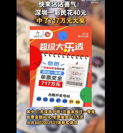 超级大乐透第26023期开奖,深圳彩民花40元买彩票中了7170000元 2026-03-11 09:38 今日头条 3月7日,超级大乐透第26023期开奖。前区开出号码09、25、26、27、28;后区开出号码01、08。其中,广东深圳龙岗中得1注基本投注一等奖,彩票金额40元,单票奖金717万元。