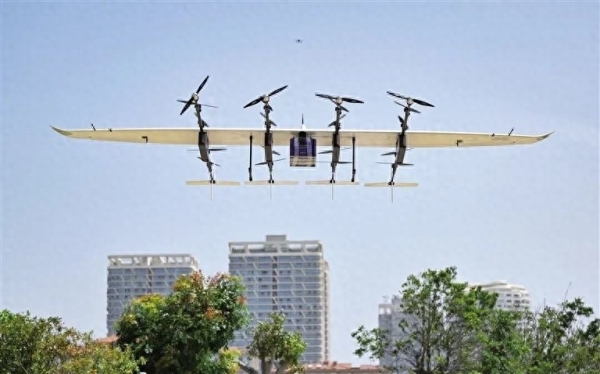一架物流无人机装载货物从位于海南海口的消博会展馆外起飞,跨越琼州海峡飞往广东徐闻港。图源:新华社