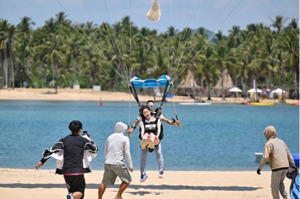 2025年5月2日,游客在三亚塔赫跳伞基地体验跳伞。图源:新华社