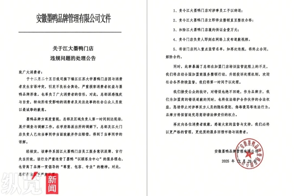 同日,品牌方安徽墨鸭品牌管理有限公司发布公告,称已在派出所调解下,由总部和门店负责人对当事大学生当面道歉并赔偿,得到对方谅解。