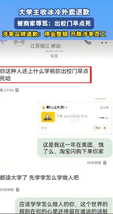 大学生收到外卖发现冰凉申请退款,被商家发信息辱骂"出校门早点死",涉事员工辞退