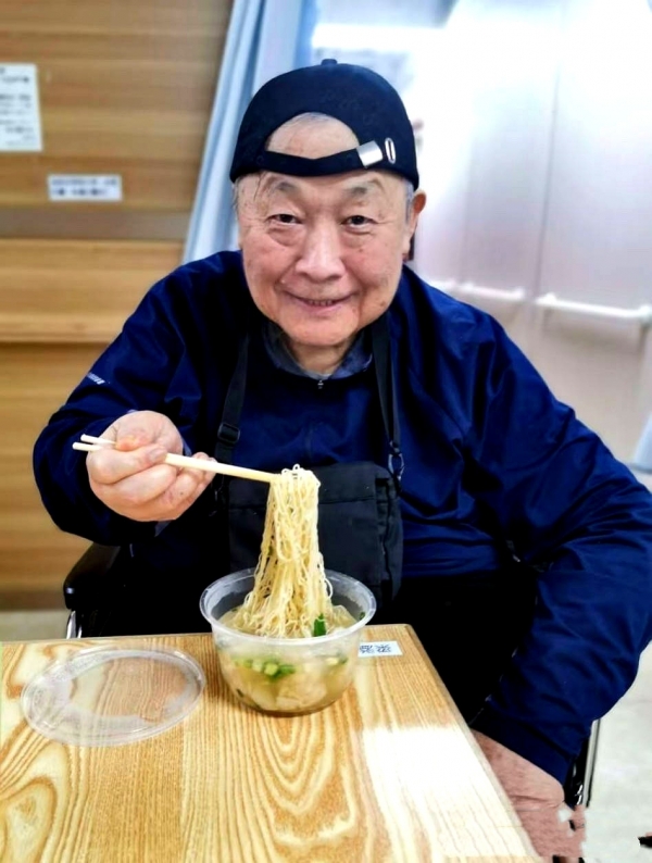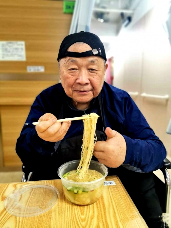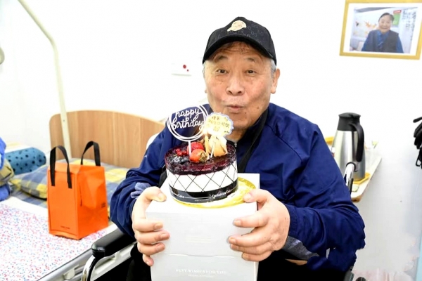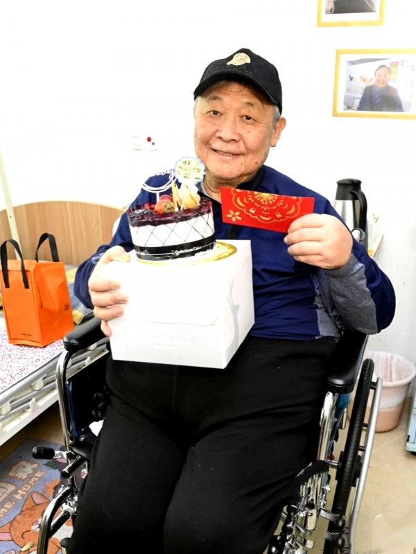 没有子女到场,是媒体给他带了蛋糕和一碗长寿面。