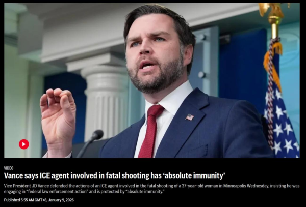 为什么这么说?一方面是移民局执法的时候,往往身着便装不走程序,想抓人就抓人,对普通人来说他们根本无从分辨来的人到底是执法机构还是匪徒--当然,其实也没什么差别。而之所以移民局可以如此嚣张,是因为其作为一个联邦直属的执法机构,按照美国副总统万斯的辩护,拥有"绝对豁免权"(absolute immunity)。