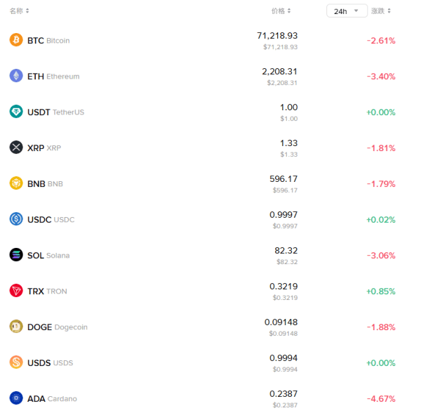 此外,主流币种价格也集体走低,ETH、SOL最近24小时内跌幅超3%,DOGE、XRP等纷纷走低。
