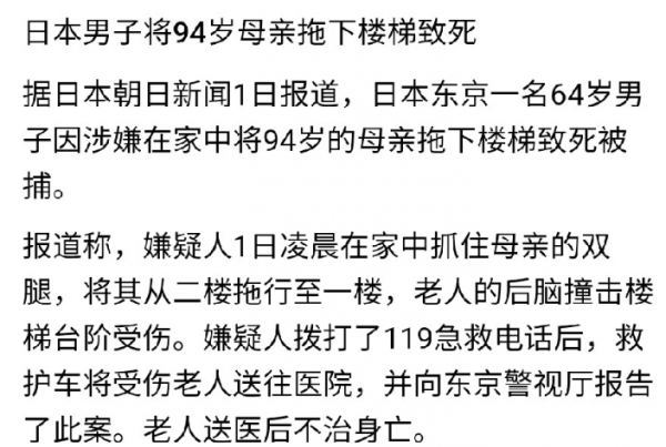 日本东京,一个64岁的儿子,把自己94岁的老母亲……活生生从楼梯上拖了下来。就因为他妈尿床了,他想带她去厕所,觉得这是"最快的办法"。老人后脑勺撞在台阶上,送到医院,人没了。