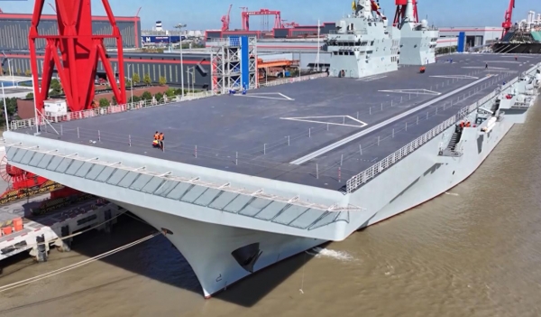 除了内部空间大之外,076宽阔平直的甲板,也不比航母小多少。
