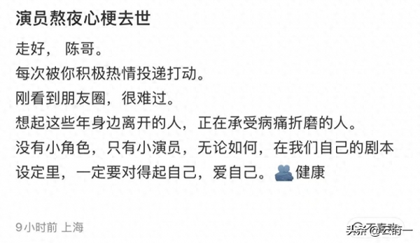 而对于陈宇这样的绝大多数来说,演戏是一场拿着健康做筹码的豪赌。大家都惋惜他这是硬生生把自己"熬"没了。