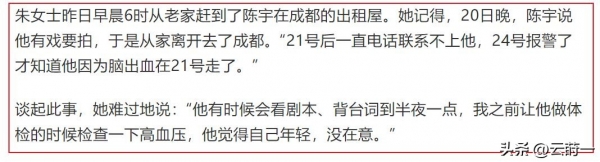 据与其母亲有过接触的记者了解,那个夺走陈宇生命的元凶是脑出血,而非外界一开始误传的单纯心梗。