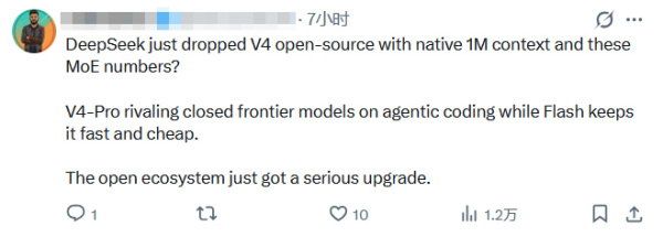 在海外社交媒体上,许多外国网民也第一时间关注了DeepSeek的更新。有外国网民表示:"V4-Pro在Agentic Coding方面可以与闭源前沿模型媲美,Flash则保持快速和廉价。开源生态系统刚刚经历了重大更新。"