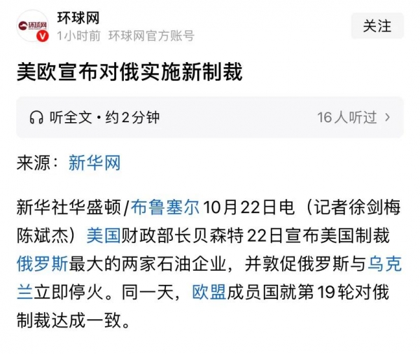 随后,美国财政部通过其外国资产管制办公室(OFAC)对俄罗斯实施了新的制裁,把两家俄罗斯石油巨头,也就是排名前两位的俄罗斯石油公司和他们从事石油和天然气生产、加工和销售的30多家子公司一起加入了制裁的"黑名单"。