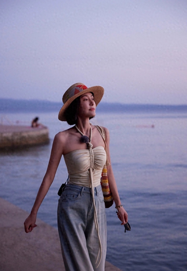 配饰不是加分项,是本人的一部分。草帽不是道具,是防晒刚需;小白鞋不是造型选择,是海边沙子多,平底比高跟实用一百倍;包上的颜色不是为了拍照好看,是她喜欢那个调子,买了就背。这些东西加起来,不是"搭配",是生活本来的样子。