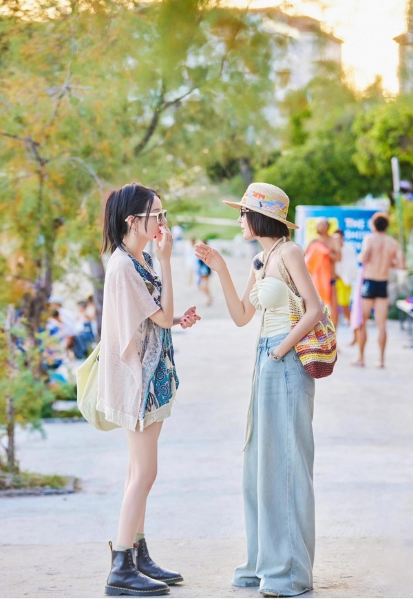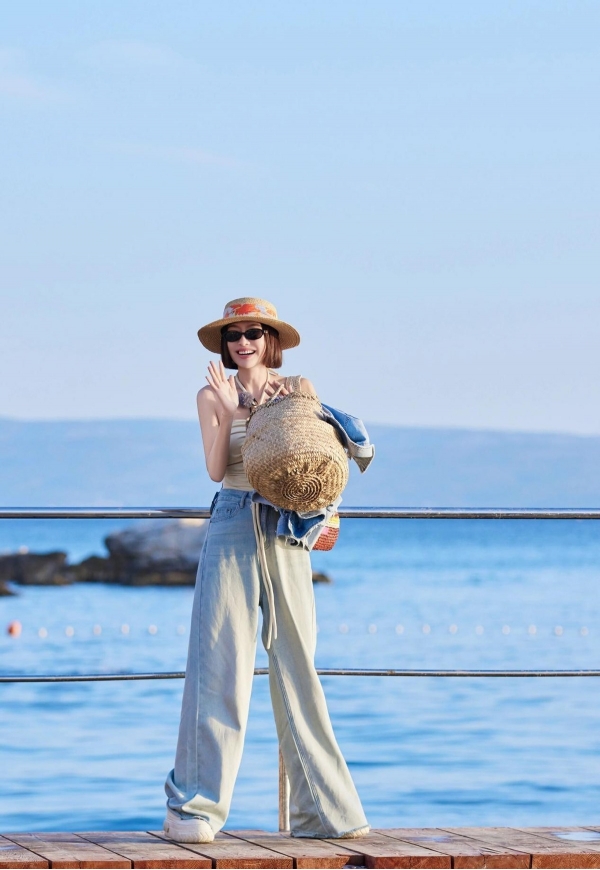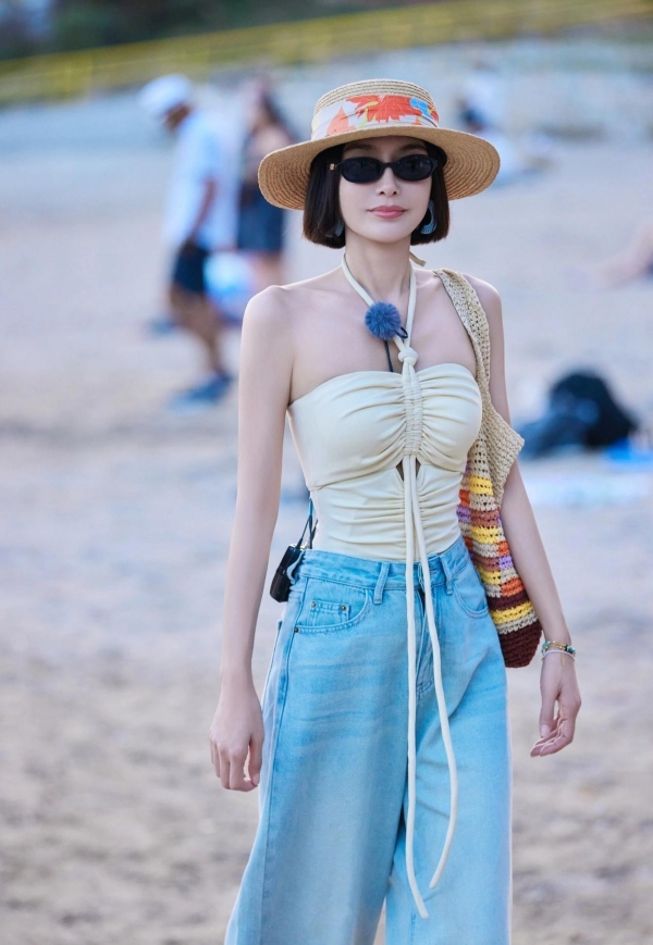 帽子是草编的,宽檐,边沿有点毛边。海边太阳毒,戴帽子不稀奇,但她戴得不慌。帽檐把额头和颧骨的光挡掉一部分,脸反而显得更立体,不是靠滤镜修出来的。小白鞋是平底,鞋带系得工整,但不是那种"为了拍照才穿"的样子。包是彩色编织的,黄绿蓝混在一起,挺扎眼,但跟她衬衫的颜色能搭上。没人规定40岁以后只能背黑包灰包,她背得坦然,就像她吃火锅不忌红油,熬夜拍戏后照样早起喝燕麦粥。