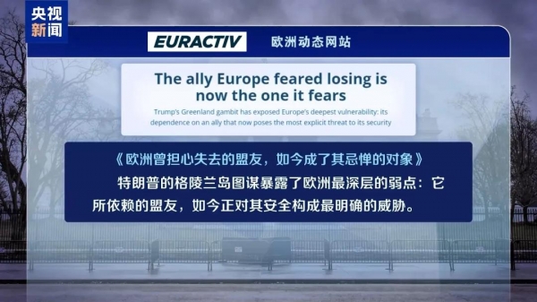欧洲动态网站6日以《欧洲曾担心失去的盟友,如今成了其忌惮的对象》为题评论说,"特朗普的格陵兰岛图谋暴露了欧洲最深层的弱点:它所依赖的盟友,如今正对其安全构成最明确的威胁。"文章还提醒说,我们正进入一个"强权即公理"的新世界--而欧洲人对此毫无准备。或许,格陵兰岛可能带来的羞辱,将促使欧洲人反思这一现状,并最终采取行动改变局面。