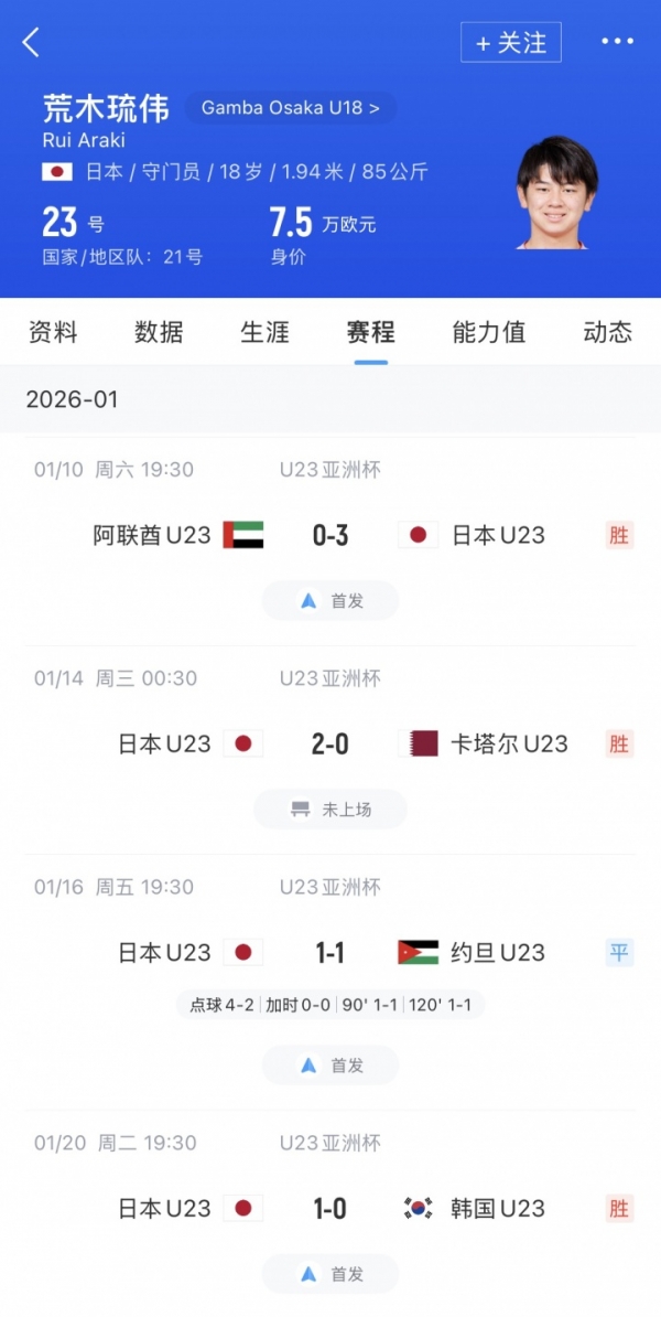 三年前U17亚洲杯日本夺冠时,荒木琉伟是替补,荒木琉伟谈及自己成长说道:"关键在于赛前准备,对每个动作都要做好充分准备。无论是扑救射门还是应对高空球,任何环节都离不开充分准备。当我意识到这一点后,开始通过站位和预判做好准备,从而提高。"