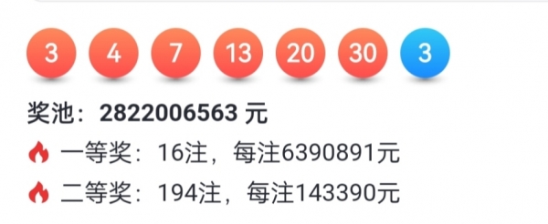 本期开奖后,下期一等奖奖池累计金额为28亿2200万余元