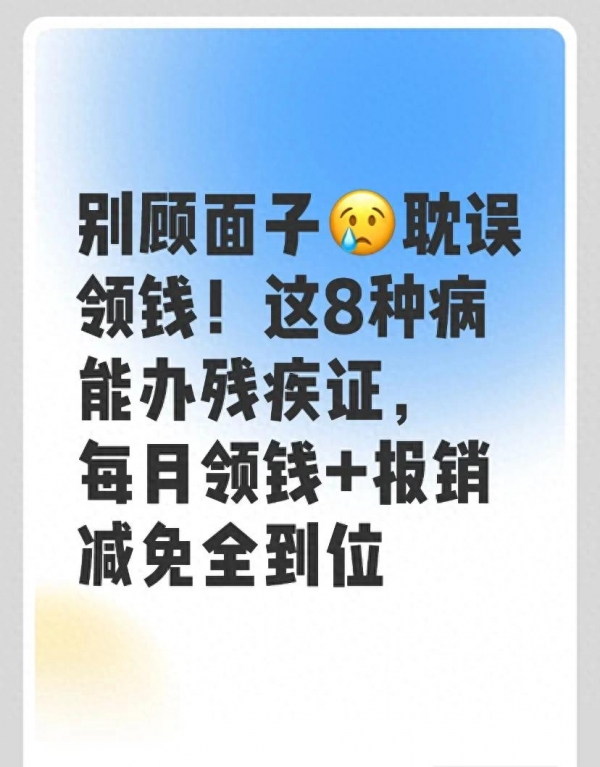 2026年政策更宽松、流程更简单,符合上面8种病的,别再犹豫、别再观望,赶紧准备材料去申请。早一天办证,早一天领钱,早一天享福利,别让面子,耽误了全家的日子。