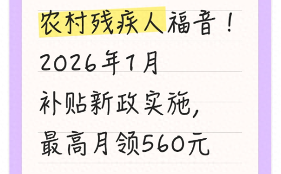 对农村残疾人朋友来说,2026年一开年就迎来了实打实的政策红利--农村残疾人补贴新政将于2026年1月1日起正式实施。这次新政不是小修小补,而是围绕"提标、扩围、简化流程"三大核心升级,补贴最低涨幅超20%,还新增了三类受益人群,符合条件的农村残疾人最高每月能领560元,切实为农村残疾人群体减轻生活和照护压力。