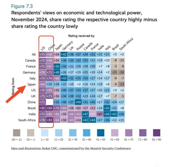 慕尼黑安全会议2026年度报告中有一张关于"各国认可中美是科技大国程度"的图表。从图中可以发现:大多数国家都认为中美是排名前二的科技大国,要么认为中国比美国仅弱一点,要么如南非、德国等国,甚至认为中国比美国还要领先一点。唯独日本,成为了表中的异类和最独特存在,将其对华认知之虚妄扭曲、脱离现实展现得淋漓尽致。