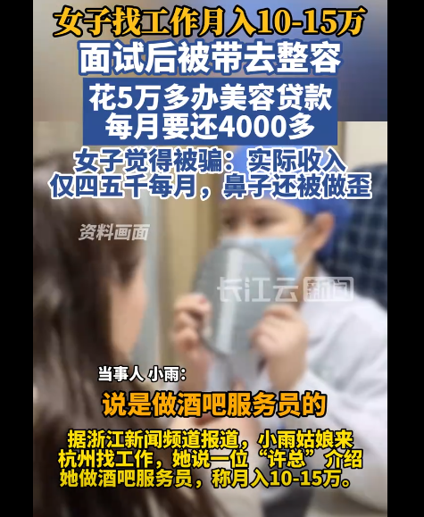 据浙江新闻频道报道,小雨姑娘来杭州找工作,她说一位"许总"介绍她做酒吧服务员,称月入10-15万。不过,"许总"建议她先整形。小雨面试后就被带去面诊,当天晚上安排了手术,做了鼻综合、眼综合、面部抽脂等项目,共花费5万多,小雨办了美容贷款,每月要还4000多。上班后,小雨发现几个同事是同样遭遇,关键是大家的收入远远没有10万,她们觉得被骗了。