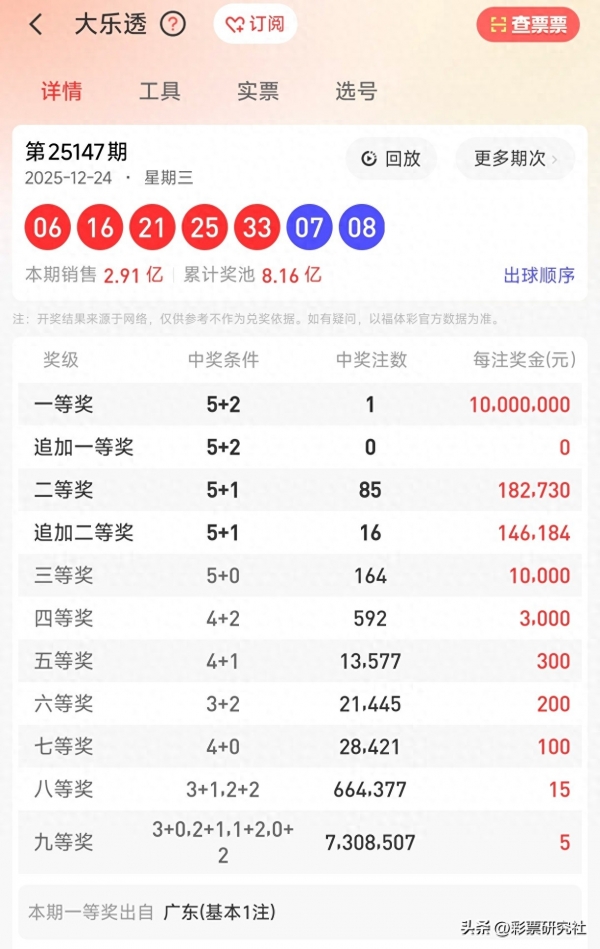 12月24日,体彩大乐透第25147期开奖结果揭晓,本期红球号码为06、16、21、25、33,蓝球号码为07、08,开奖日恰逢圣诞平安夜,却并未迎来头奖的"井喷"态势。