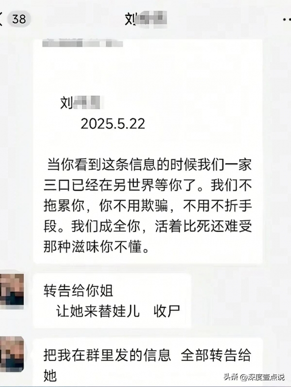 5月22日凌晨两点,刘华杰先后将遗书发至家人群和小舅子黄鹏,遗书中刘华杰承认打过妻子,并称黄芸飞曾经出轨(事后黄芸飞接受采访时否认了这一事情)。在发给小舅子的私信里,刘华杰让黄鹏转告黄芸飞:"让她替娃儿收尸"。看到消息后,黄鹏立即报警并通知双方亲属。然而,当警方赶到时,为时已晚,两个孩子已经出现明显的中毒现症状,紧急送医也未能挽回。刘华杰哄骗两个两个孩子喝下农药后,试图自杀,但被赶到的警方送医抢救后脱离生命危险。