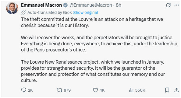 巴德拉写道:"卢浮宫是我国文化的全球象征。这起盗窃案中,窃贼竟能偷走法国皇室珠宝,对我们而言是一种无法容忍的耻辱。"