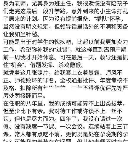 该老师之所以遭到家长的举报,是因为在上课的时候穿了一件孕妇装,可能听上去有些离谱,但是看完照片之后,有人却说处分是合理的。可以看到老师挺着大肚子,看上去十分辛苦,最重要的是孕妇装有些透明,可以约看到女老师的肚子。