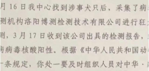 更令人担忧的是,咬伤辛女士的流浪狗在被小区物业控制后,于三四天内死亡。事后相关检测结果显示,该狗携带狂犬病毒,为阳性。