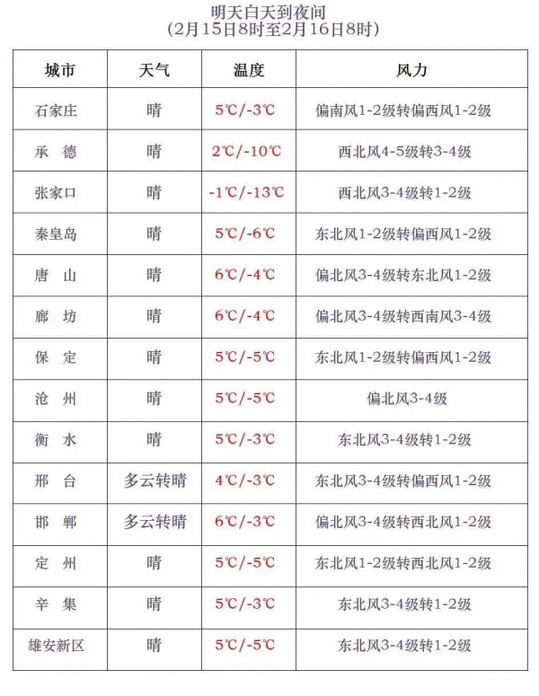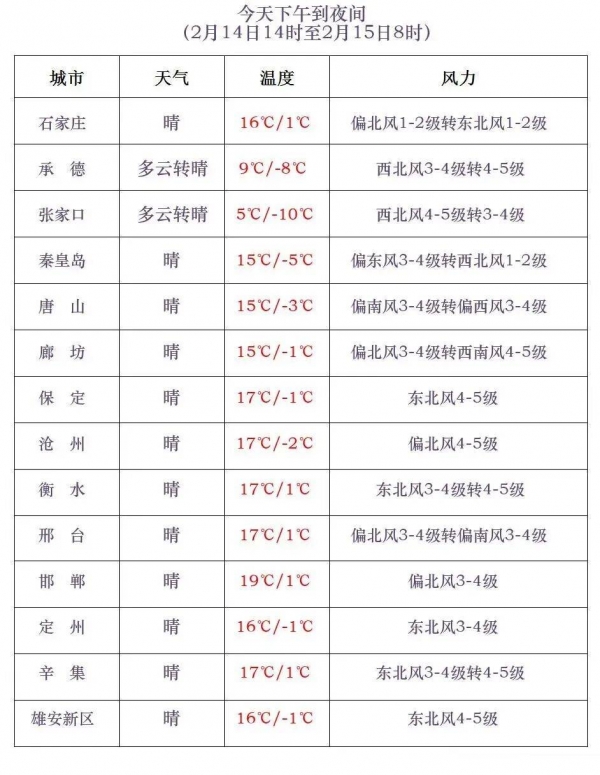 2月14日下午到15日白天,保定东部、雄安新区、廊坊、石家庄东部、沧州、衡水、邢台、邯郸有北到东北风4级至5级,阵风6级至7级。渤海海域和沿海地区有北到东北风5级至6级,阵风7级。