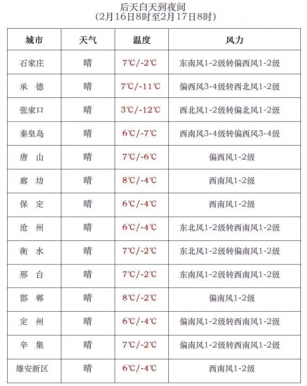 2月16日早晨,最低气温张家口、承德、保定西北部、秦皇岛北部降至-19℃至-10℃,其中坝上地区降至-24℃至-20℃,其他地区降至-9℃至-2℃。