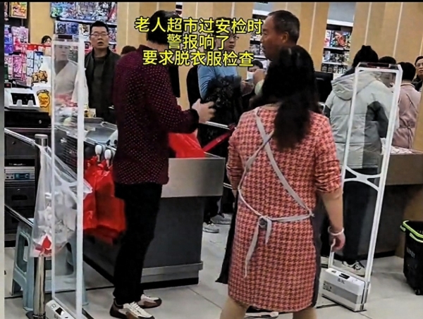 他认为老人的身上一定有商品没有付钱,否则不可能触发警报,老人为了自证清白,当场掀起了衣服让工作人员看,什么也没有。