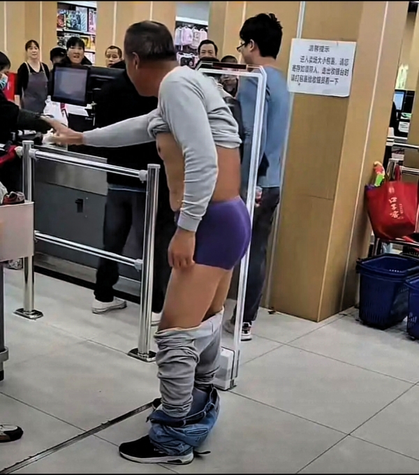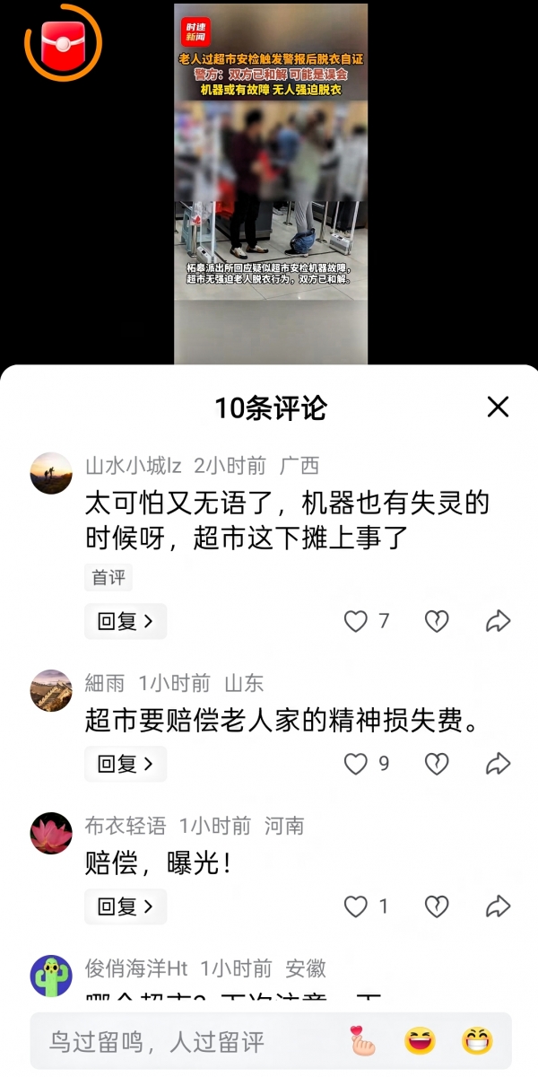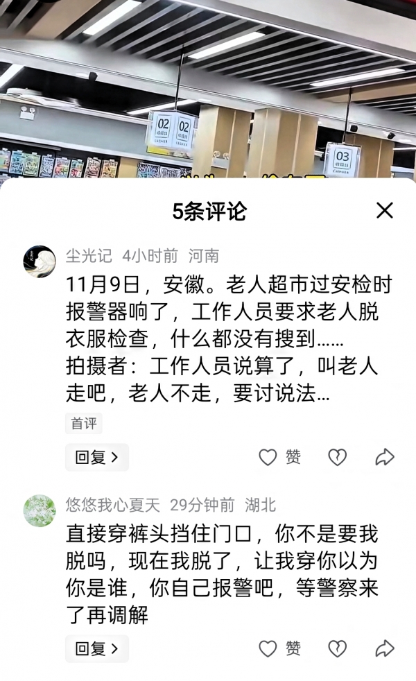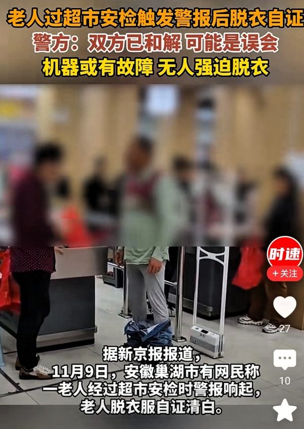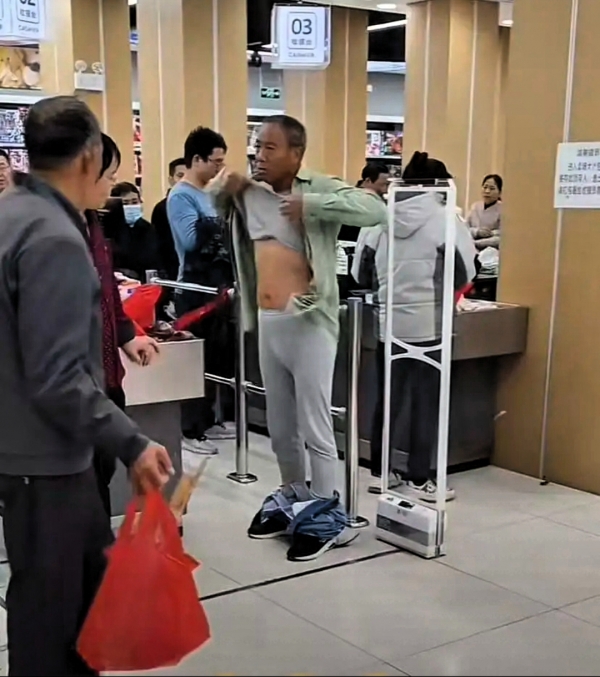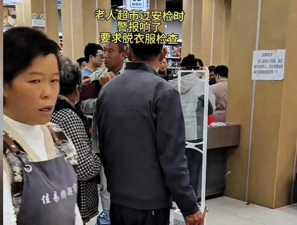 这件事被超市里购物的顾客用手机拍摄发到了网上,引起广大网友愤怒。一个超市你自己机器有问题,这就让一个老人了在那里自证清白脱衣检查。