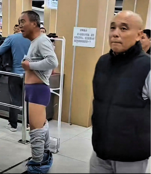 工作人员表示,衣服里边一定有东西,老人只好脱掉外衣,退下裤子,再次经过安检门警报依然在那里响。