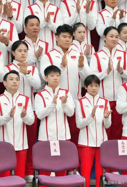 这次,马龙将参加巴黎奥运会,他坐在众多运动员中间。