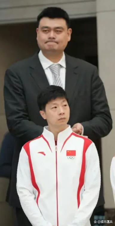 马龙和姚明站在一起,姚明高挑的身材显得马龙有些矮小。