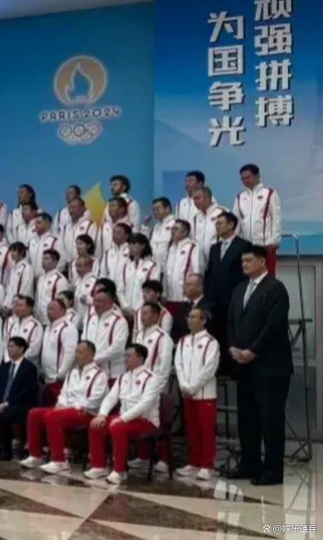 由于身高过高,姚明站在了角落里,与第四排的人一样高,使得角落里的姚明看起来很可爱。