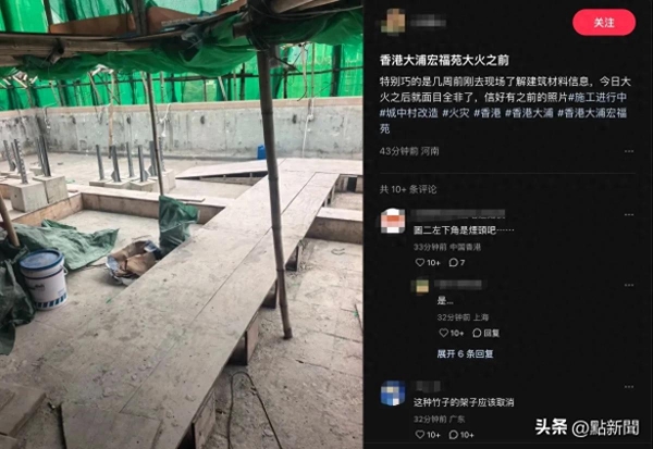 大埔宏福苑今日(26日)下午2时51分突发火警,火势猛烈,三小时内由三级升至五级。有网友在社交平台发文指,几周前曾去到宏福苑现场了解建筑材料信息,并附上现场图片。据网友发布照片,在施工现场有熄灭烟头。