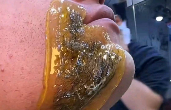 大爷找了块地方坐下,没做任何皮肤测试。直接把加热好的蜜蜡厚厚糊在下巴胡子上,抹得均匀平整,等着慢慢凝固。旁边人帮忙按着皮肤,找准边缘,猛地一下就撕下来。